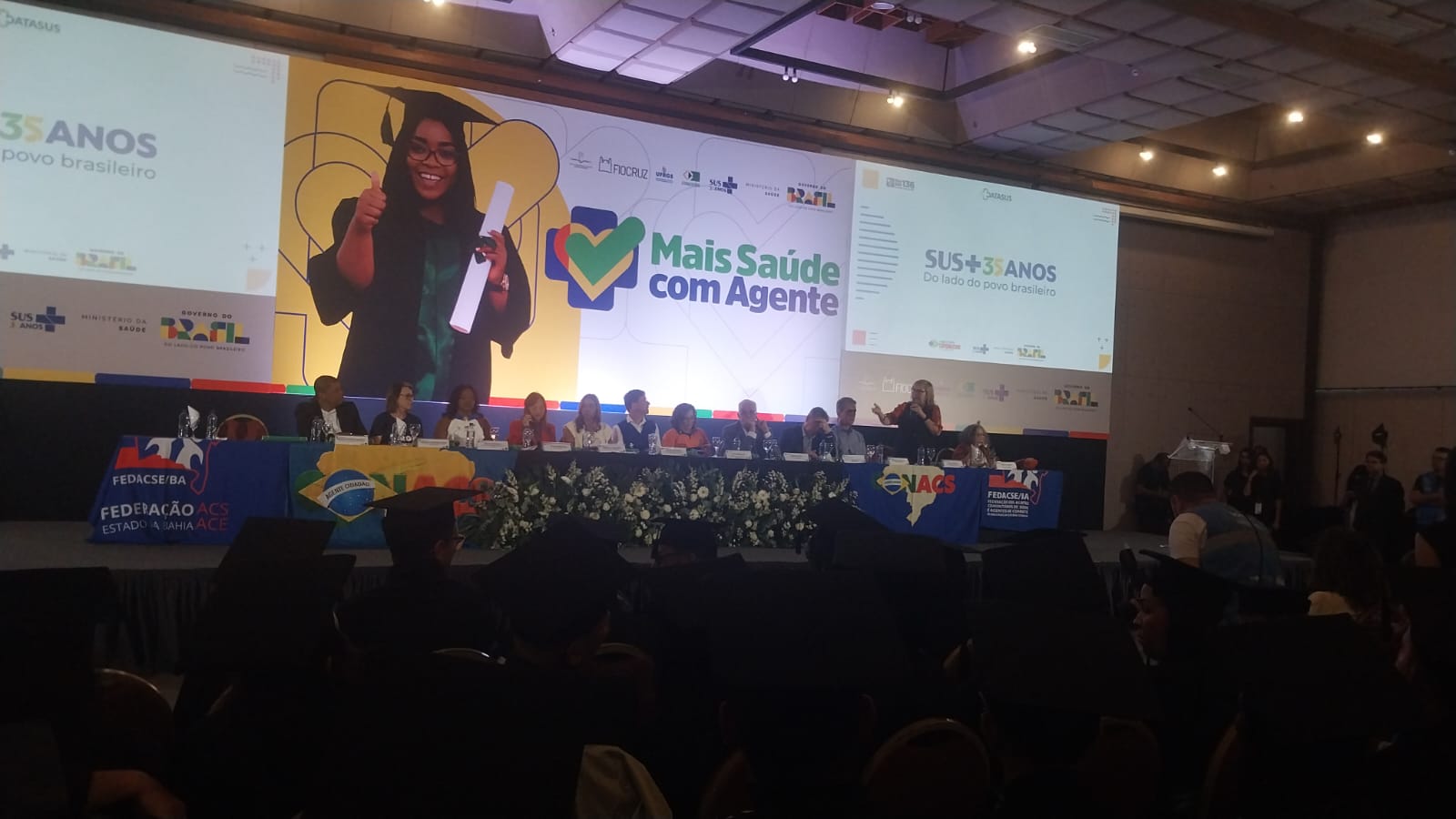 O evento aconteceu das 10h às 12h30, no Auditório do Fiesta Bahia Hotel Convention Center, no bairro do Itaigara, e celebrou a formação de 7.699 agentes baianos, que agora passam a contar com certificação técnica para atuar nos territórios do Sistema Único de Saúde (SUS).
