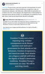 O texto da Embaixada foi escrito em português. Não está claro se a expressão “Supremo Tribunal de Moraes” foi usada intencionalmente ou se houve erro de tradução — talvez o objetivo fosse apenas mencionar o STF, do qual Moraes é integrante.
