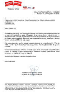 O hospital é referência para Camacan e municípios vizinhos, o que amplia a gravidade da situação. A paralisação não representa apenas uma reivindicação trabalhista, mas um alerta sobre o risco iminente de colapso do atendimento à saúde em toda a microrregião.O sindicato informou ainda que o comunicado de greve foi encaminhado ao Ministério Público do Trabalho, à Gerência Regional do Trabalho e Emprego e aos órgãos de imprensa, buscando dar transparência ao impasse e pressionar por uma solução imediata.