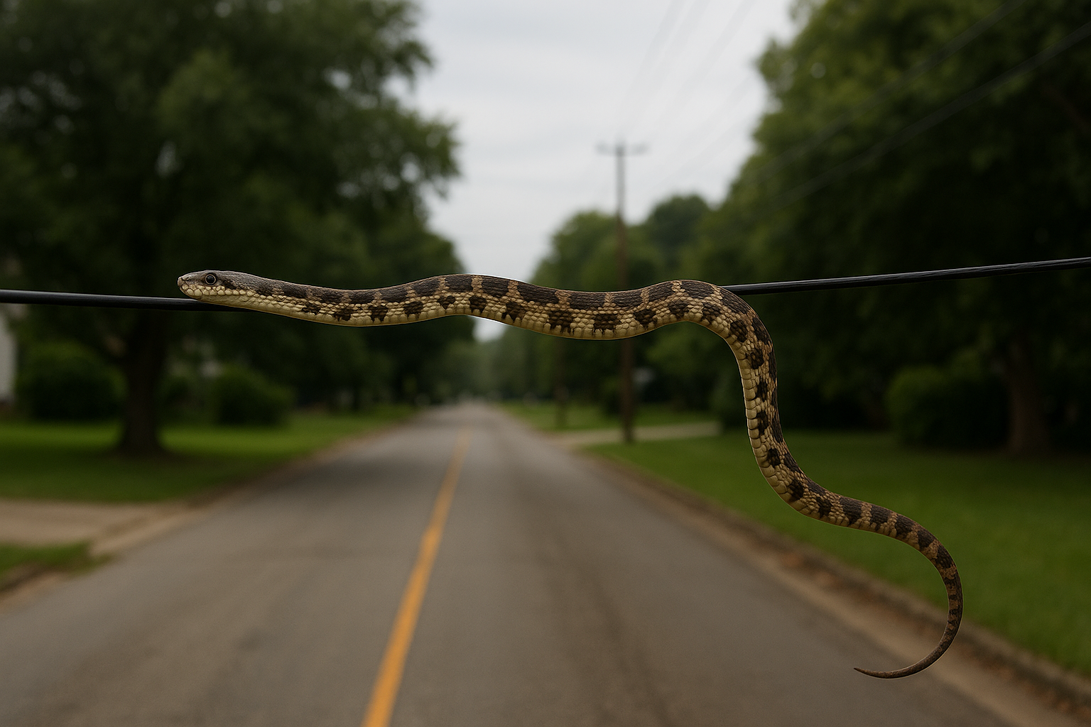 de 2025. Uma cobra peçonhenta da espécie Bothrops jararaca — popularmente conhecida na região como patrona — foi flagrada atravessando a rua Francisco Rodrigues, deslizando tranquilamente sobre fios de internet!
