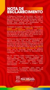 A gestão municipal também afirmou que a estimativa inicial foi calculada com base em pesquisa de preços realizada em consórcio com bancos de preços e fornecedores locais, dentro dos critérios legais e de mercado. A nota finaliza reafirmando o compromisso da administração com a transparência, ética e responsabilidade na gestão dos recursos públicos, além de repudiar o que classificou como “tentativas de distorcer os fatos”.