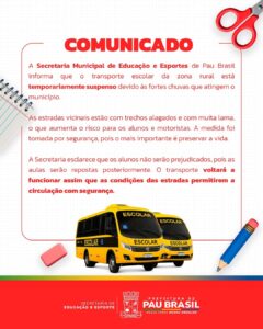 A Secretaria Municipal de Educação e Esportes de Pau Brasil informou que o transporte escolar destinado aos alunos da zona rural está temporariamente suspenso em virtude das fortes chuvas que têm atingido o município nos últimos dias. De acordo com a Secretaria, a decisão foi tomada após avaliação das condições das estradas vicinais, que apresentam diversos trechos alagados e com grande quantidade de lama. Essas condições aumentam significativamente os riscos para a circulação dos veículos escolares, podendo comprometer a segurança dos estudantes e dos motoristas.