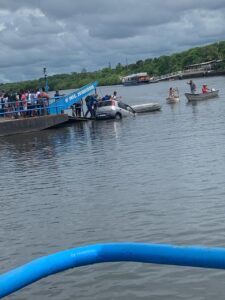Durante a tentativa, o veículo acabou sendo arrastado e caiu no Rio João de Tiba, ficando submerso. O incidente deixou passageiros e curiosos assustados com a situação inusitada. O Mestre da Balsa e algumas pessoas em pequenos barcos tentaram ajudar, puxando o carro para fora da água.