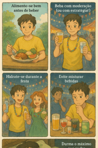 Intercale bebida alcoólica com água. A cada dose de álcool, tome um copo d’água. Parece simples, mas salva vidas — e o dia seguinte.